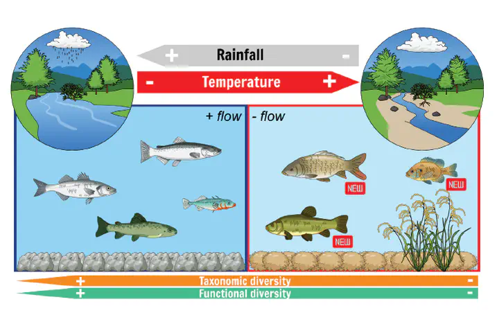 As the effects of climate change continue to intensify, non-native species are becoming more prevalent in estuarine ecosystems. This has implications for the taxonomic and functional diversity of fish communities. Historically, biodiversity has been a synonym of taxonomic diversity, however this approach often fails to provide accurate insights on ecosystem functioning and resilience. To better understand how climate change is impacting fishes and their traits’ composition, a long-term dataset from Minho Estuary (NW Iberian Peninsula) fish assemblage was analyzed. The results suggest that climate change and extreme weather events altered the prevailing trait modalities of fishes, which led to the overall decrease in functional diversity of the fish assemblage over the course of a decade. This decrease is associated to the loss of some trait modalities that are exclusively found in native species. On the other hand, the invasive species added novel traits associated with the conditions of high temperatures and low precipitation regime currently observed in the studied area. Our results highlight that the shift in the presence and dominance of some traits is directly influenced by climatic changes. Also, despite the addition of novel modalities by the invasive species, the fish assemblage is now less functional and taxonomically diverse than previously.
